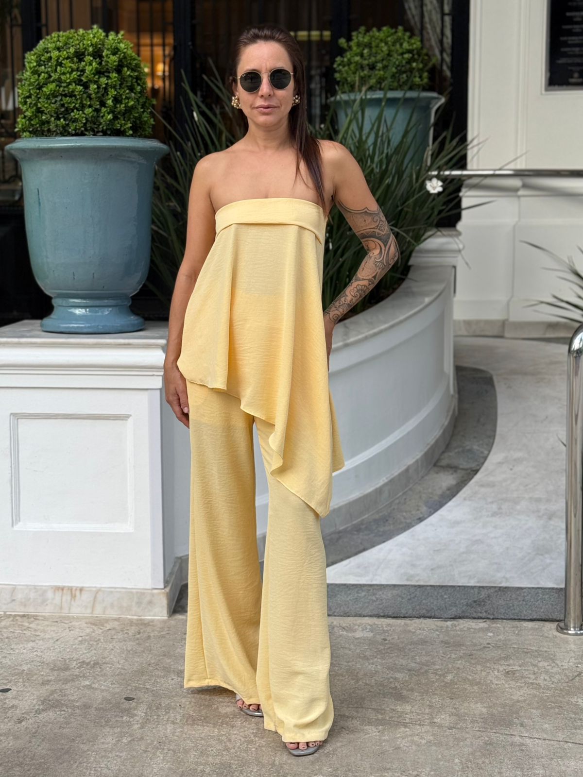 O top tomara que caia assimétrico garante um visual fashion e diferenciado, enquanto a calça pantalona alonga a silhueta e proporciona movimento elegante.
