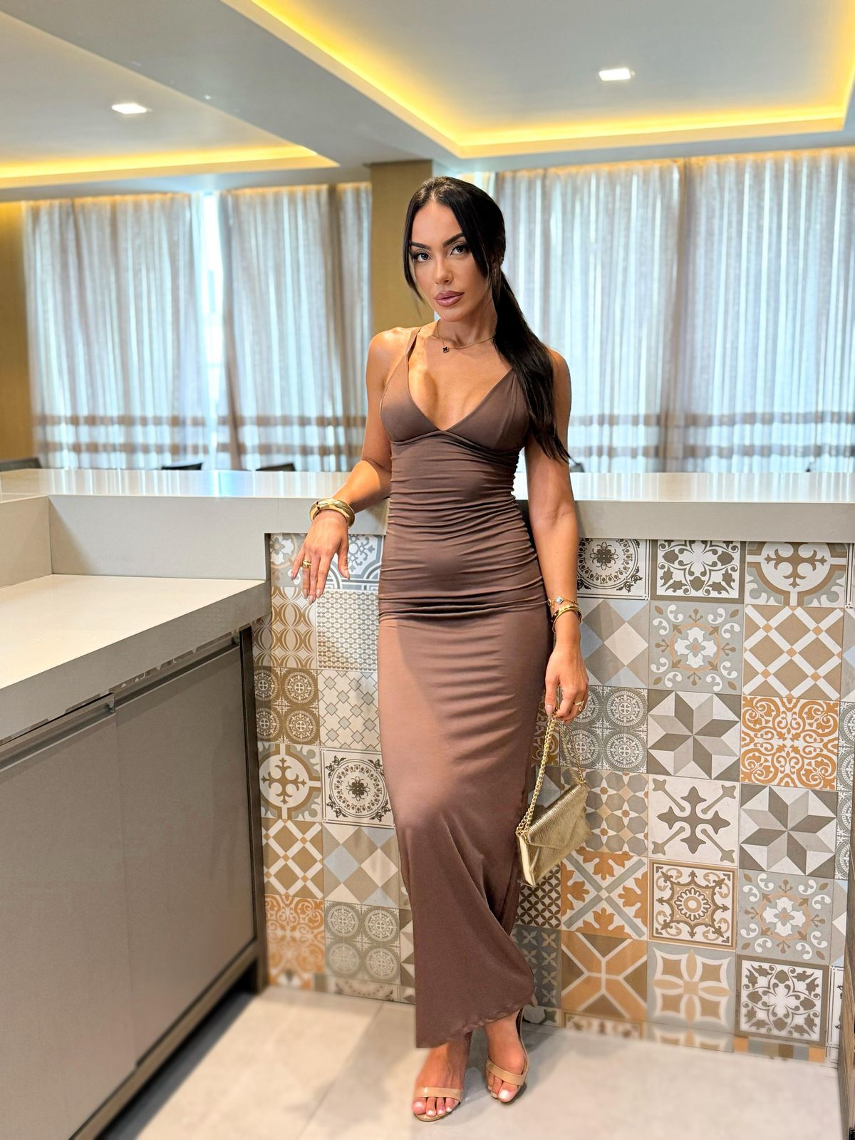 A parte do busto conta com duplo tecido, o que garante mais firmeza e segurança — nada de transparência ou incômodos. O modelo é justo e longo, perfeito para ocasiões especiais, produções noturnas ou aquele look poderoso que não precisa de muito para chamar atenção.
