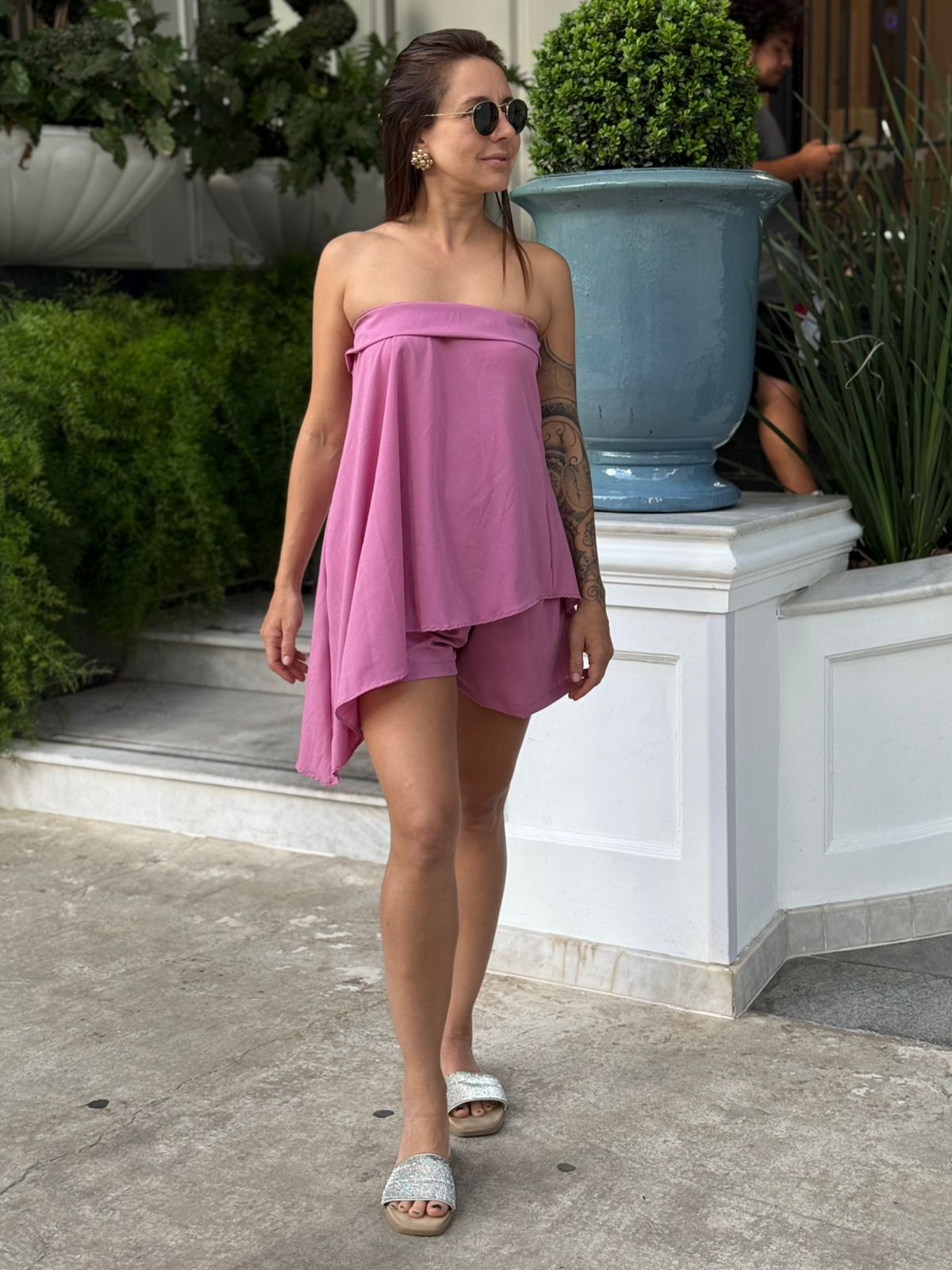 O top tomara que caia com barra assimétrica é o destaque do conjunto, garantindo um toque fashion e sofisticado. O shorts alfaiataria completa o look com elegância e praticidade, perfeito para dias quentes ou produções casuais mais refinadas.